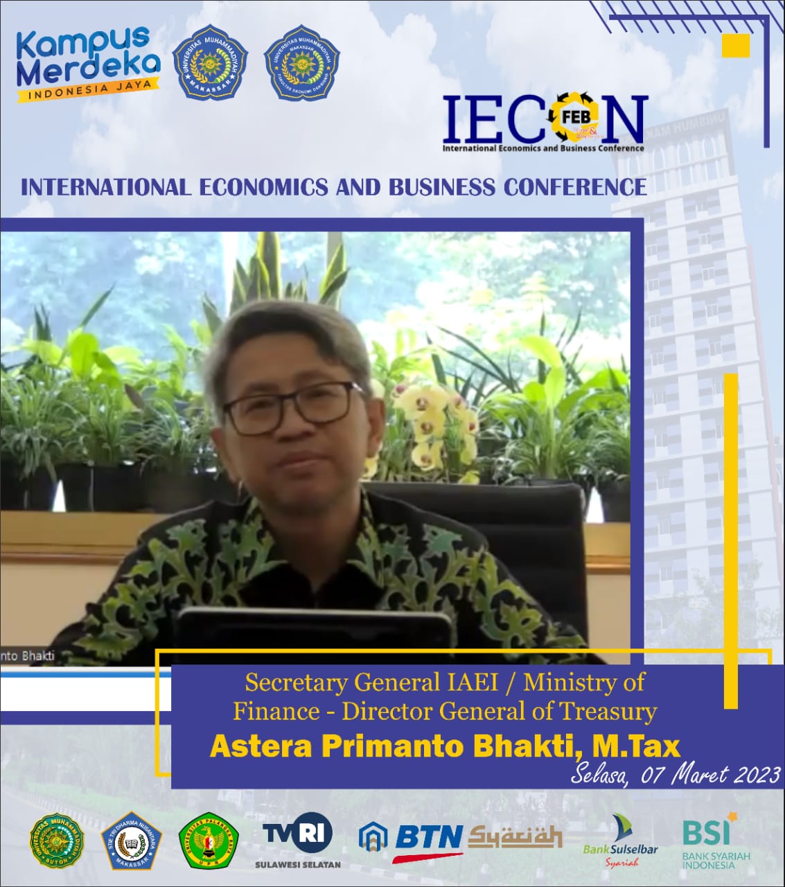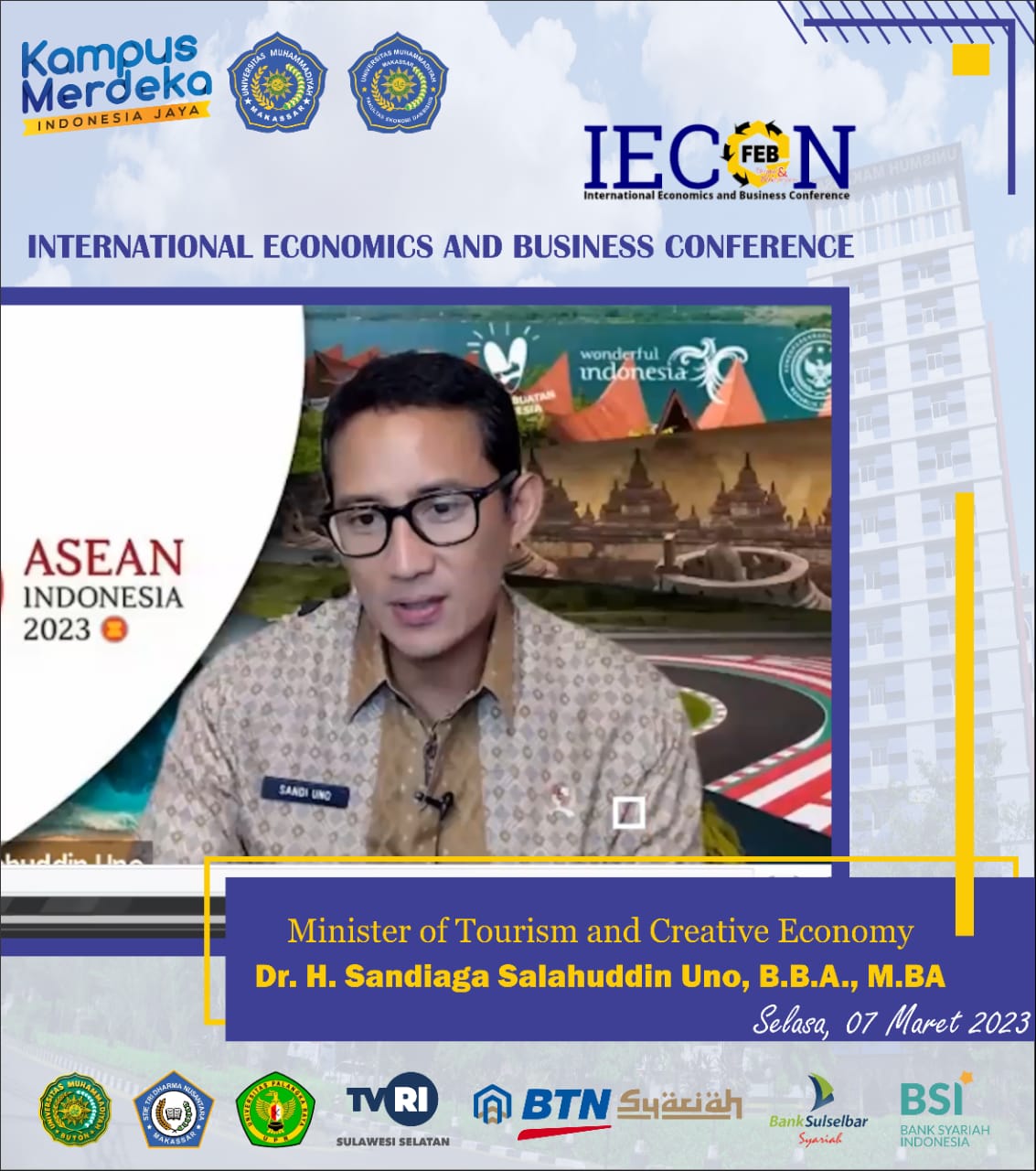 Keynote Speaker ada International Economics and Business Conference (IECON) 2023 dengan pembicara Bapak Dr. H. Sandiaga Salahuddin Uno, B.B.A., M.BA (Menteri Pariwisata dan Ekonomi Kreatif Republik Indonesia) dan Bapak Dr. Astera Primanto Bhakti, M.Tax (Secretary General IAEI/dari Kamenterian Keuangan RI)