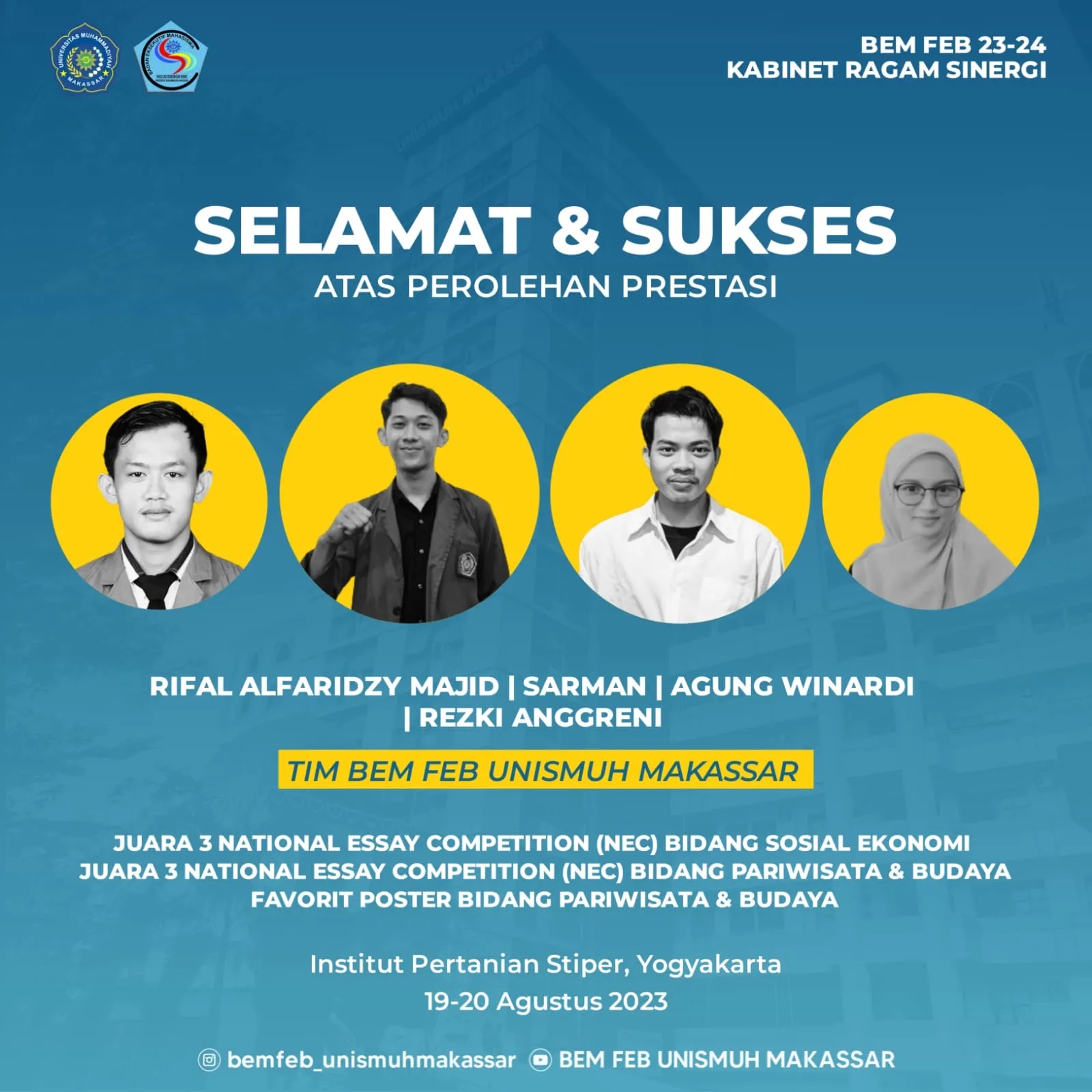YOGYAKARTA — Tiga mahasiswa Fakultas Ekonomi dan Bisnis Universitas Muhammadiyah Makassar (Unismuh Makassar) meraih prestasi gemilang di tingkat nasional dalam ajang Lomba National Essay Competition (NEC) 2023.