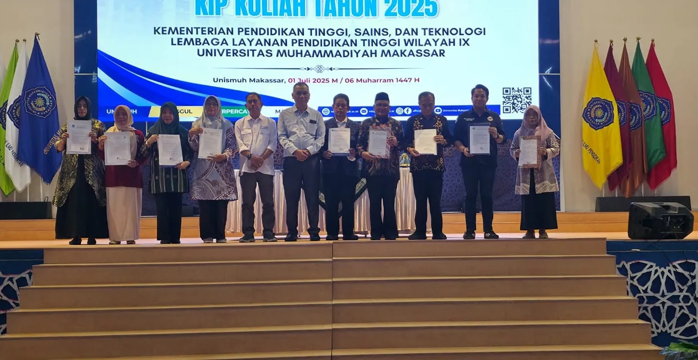 MAKASSAR — Para rektor dan pimpinan perguruan tinggi swasta (PTS) lingkup Lembaga Layanan Pendidikan Tinggi (LLDIKTI) Wilayah IX Sultanbatara menandatangani pakta integritas pengelolaan Kartu Indonesia Pintar (KIP) Kuliah dalam kegiatan Sosialisasi KIP Kuliah Tahun 2025 yang digelar di Balai Sidang Muktamar Muhammadiyah ke-47, Kampus Universitas Muhammadiyah (Unismuh) Makassar, Selasa, 1 Juli 2025.