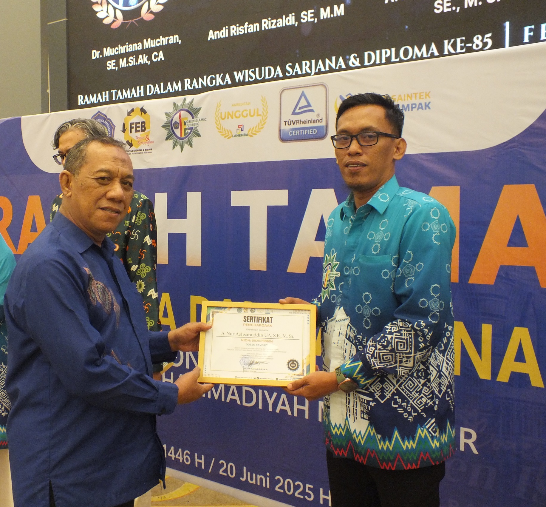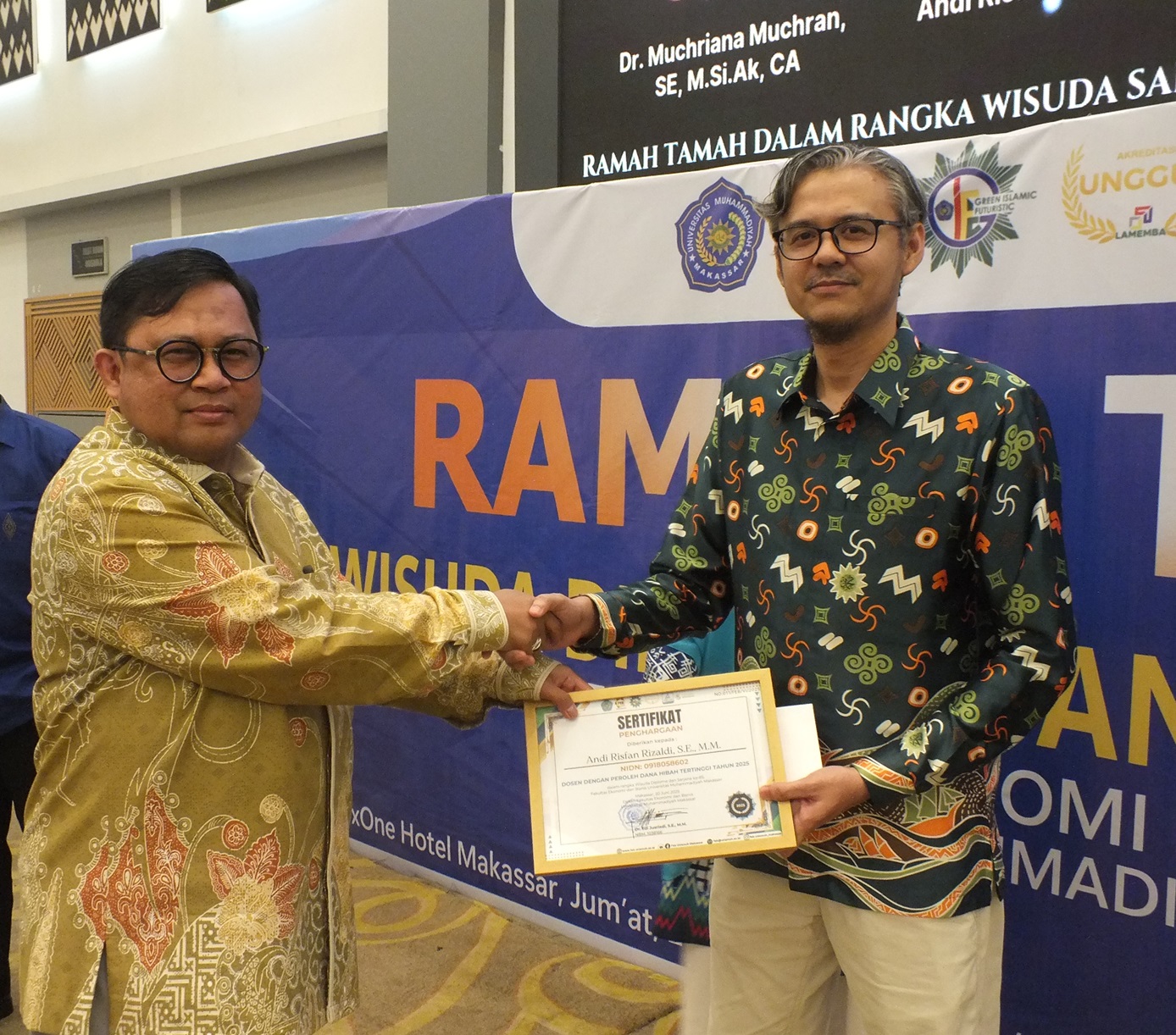 Penyerahan penghargaan kepada Dosen dengan Perolehan Hibah Tertinggi Thn 2025 oleh WR. I Unismuh Makassar Prof. Dr. H. Andi Sukri Syamsuri