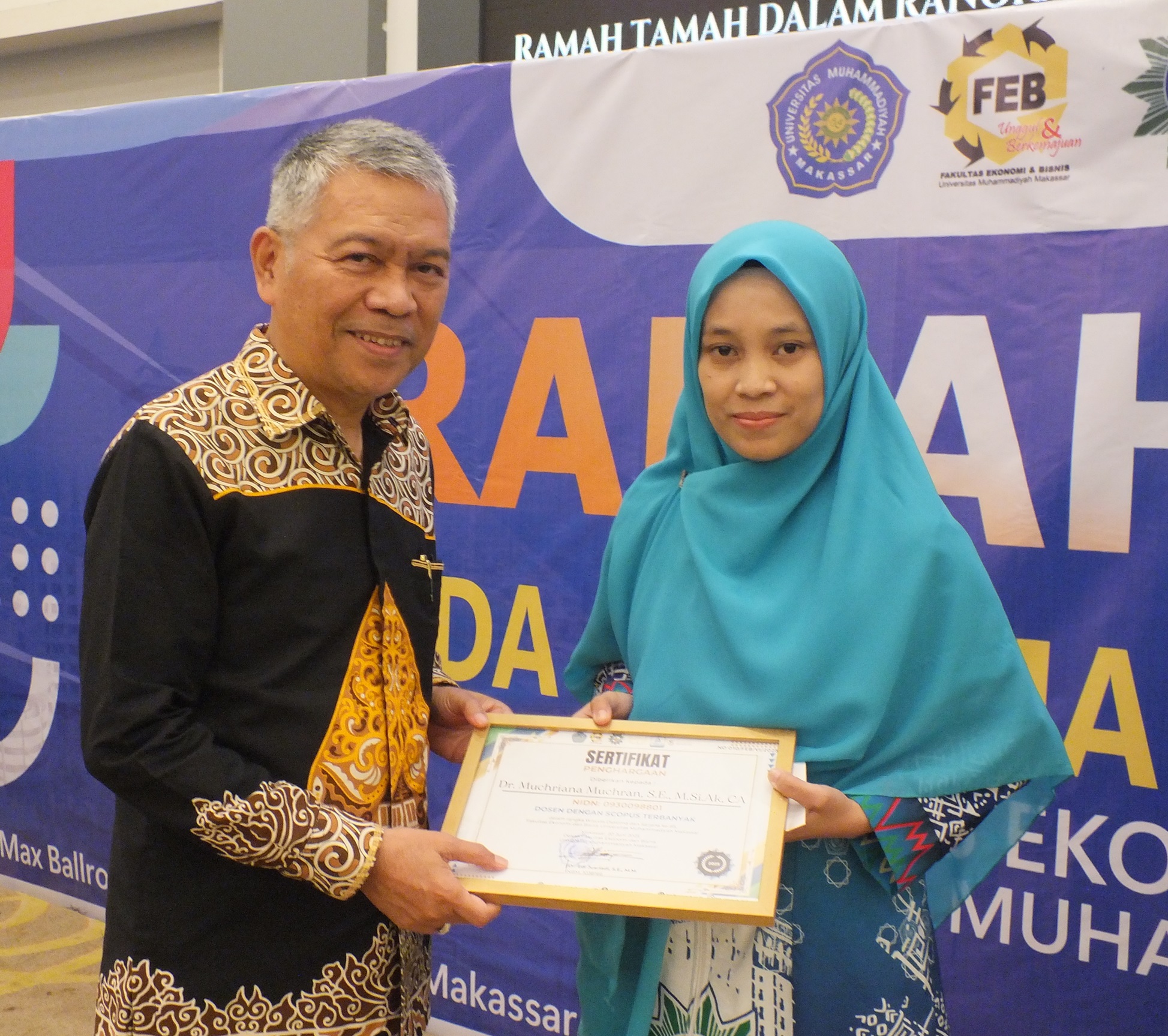 Penyerahan penghargaan kepada Dosen dengan Scopus Terbanyak Oleh Ketua BPH Unismuh Makassar Prof. Dr. Gagaring Pagalung kepada