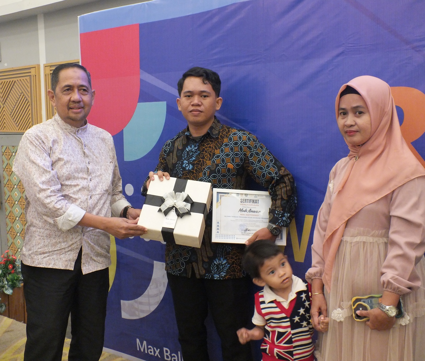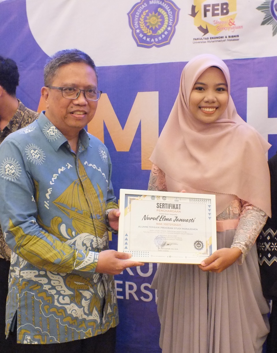 Penyerahan piagam penghargaan Alumni Terbaik dari Prodi Ekonomi Pembangunan oleh Bapak Prof. Dr. H. Abd. Rahman Rahim, M.M.