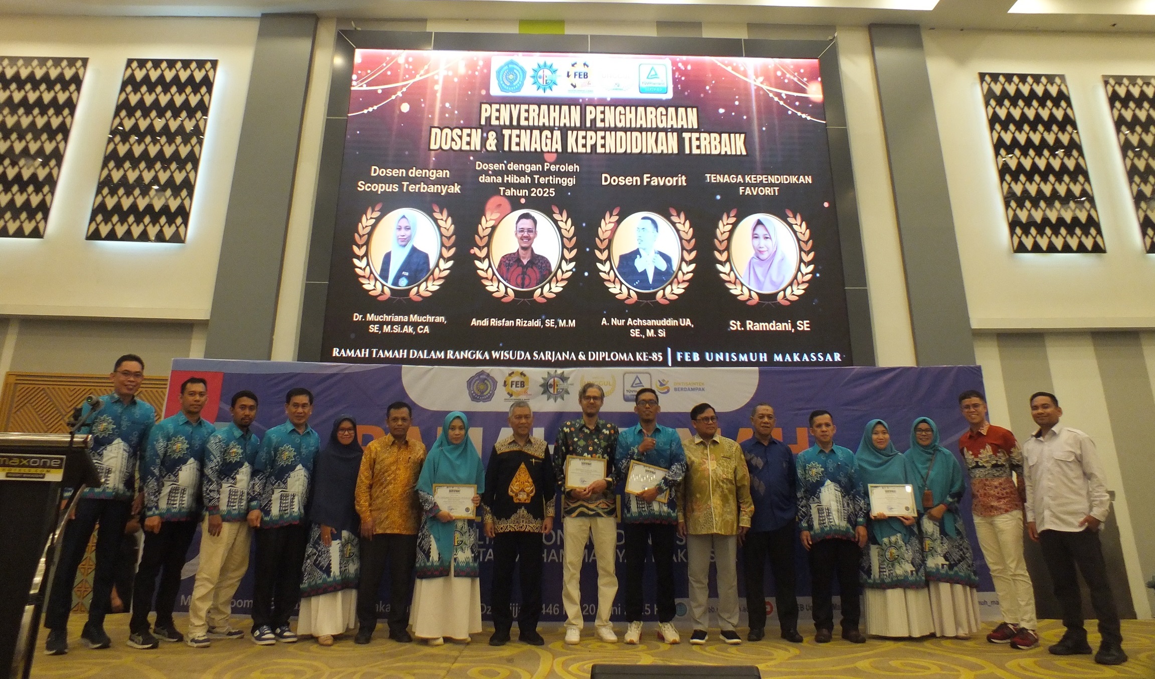 Penerima penghargaan berfoto bersama dengan BPH, WR I Unismuh Makassar, IKA Pusat, Pimpinan Fakultas dan Kaprodi serta GKM FEB