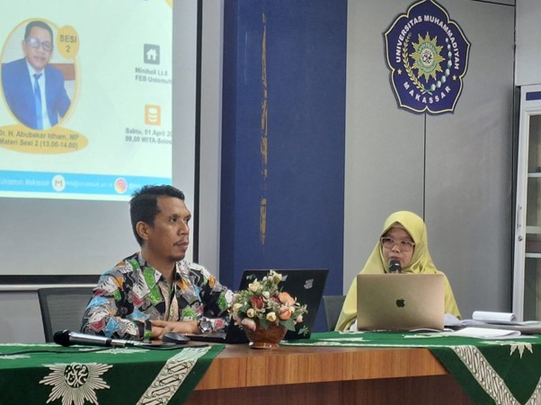 Kegiatan ini dilaksanakan pada hari sabtu, tanggal 1 April 2023 dan dibagi atas 2 sesi, sesi pertama dipandu oleh WD I FEB Agusdiwana Suarni, S.E., M. Acc. dengan narasumber Dr. Agustan, S.Pd., M.Pd. (Gambar diatas), dan sesi kedua dipandu oleh WD III FEB Abdul Muttalib, SE, MM dengan narasumber Dr. H. Abubakar Idham, M.P.